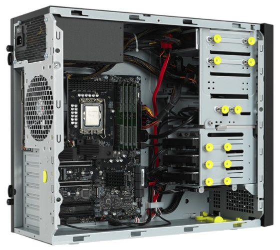 Máy trạm Asus E500 G9-1490K007Z sở hữu kiểu dáng Tower-Case đứng với kích thước 423mm x 190mm x 435mm, mang lại sự chắc chắn và ổn định khi đặt trên bàn làm việc hoặc sàn nhà. Trọng lượng 12.1kg tuy không nhẹ, nhưng lại phản ánh chất lượng gia công cao cấp và khả năng chứa đựng linh kiện mạnh mẽ bên trong. Vỏ máy được hoàn thiện với bề mặt nhám chống bám vân tay, kết hợp tông màu tối lịch lãm, phù hợp với môi trường làm việc chuyên nghiệp như phòng thí nghiệm, studio hay văn phòng kỹ thuật. Không gian bên trong được thiết kế thông thoáng, hỗ trợ tản nhiệt hiệu quả và cung cấp 5 khe cắm mở rộng PCIe, giúp người dùng dễ dàng nâng cấp phần cứng theo nhu cầu cụ thể.
